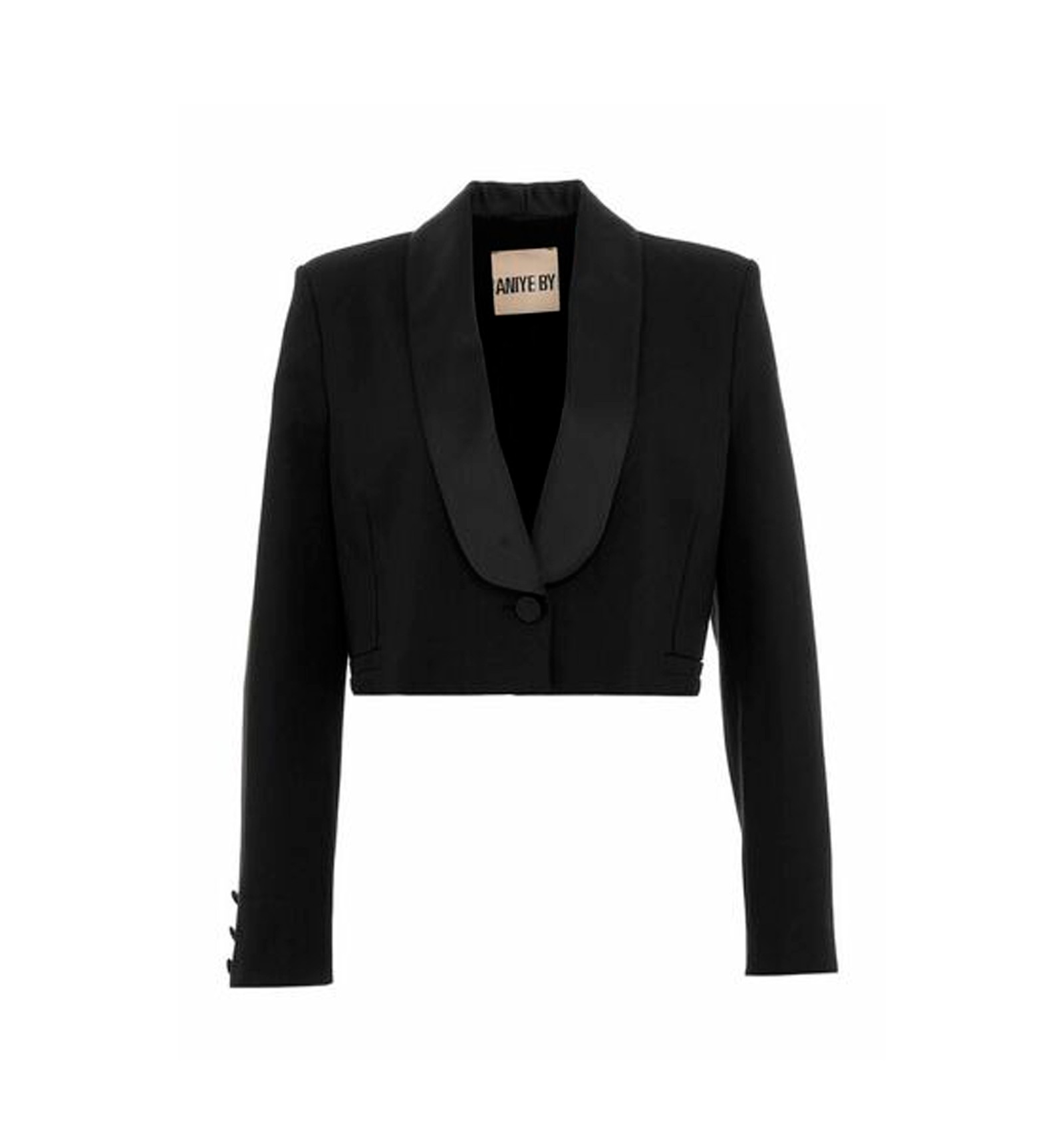 Corte Smoking en esta chaqueta Corta de Patrón impecable. Tono Negro. Ideal para Vestido y Pantalón New York Club de la firma en el mismo tejido y tonalidad.