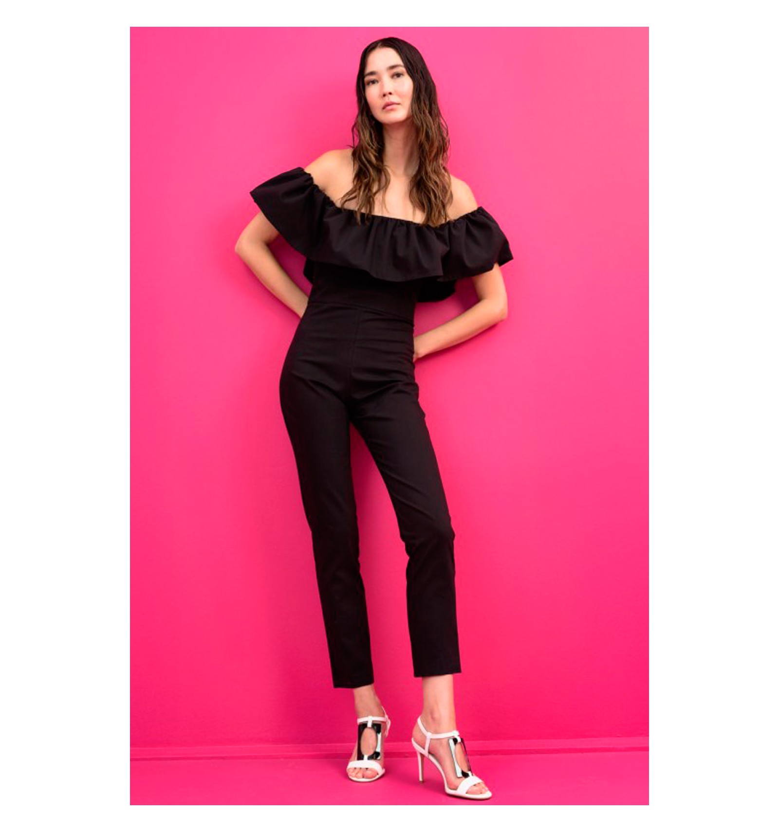 Mono en tejido elástico grueso, con cuerpo. Entallado, largo capri. Escote barco con Volante ancho en el mismo tejido que le aporta importancia a la prenda en la parte superior. Tono Negro.